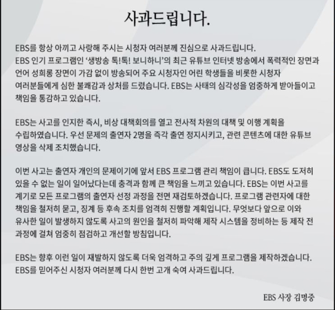 예전 EBS에서 보니하니 일이 생겼을때 김명중 사장님은 바로 사과문을 올리고 재방 방지를 약속하셨습니다!!