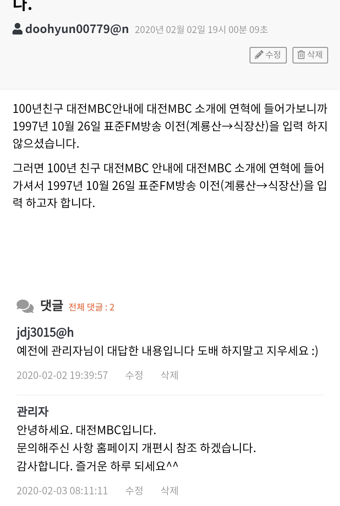 관리자님 시청자 차별하지 마시고 똑같이 답변해주세요~~ 등록일 : 2020-02-03 11:07