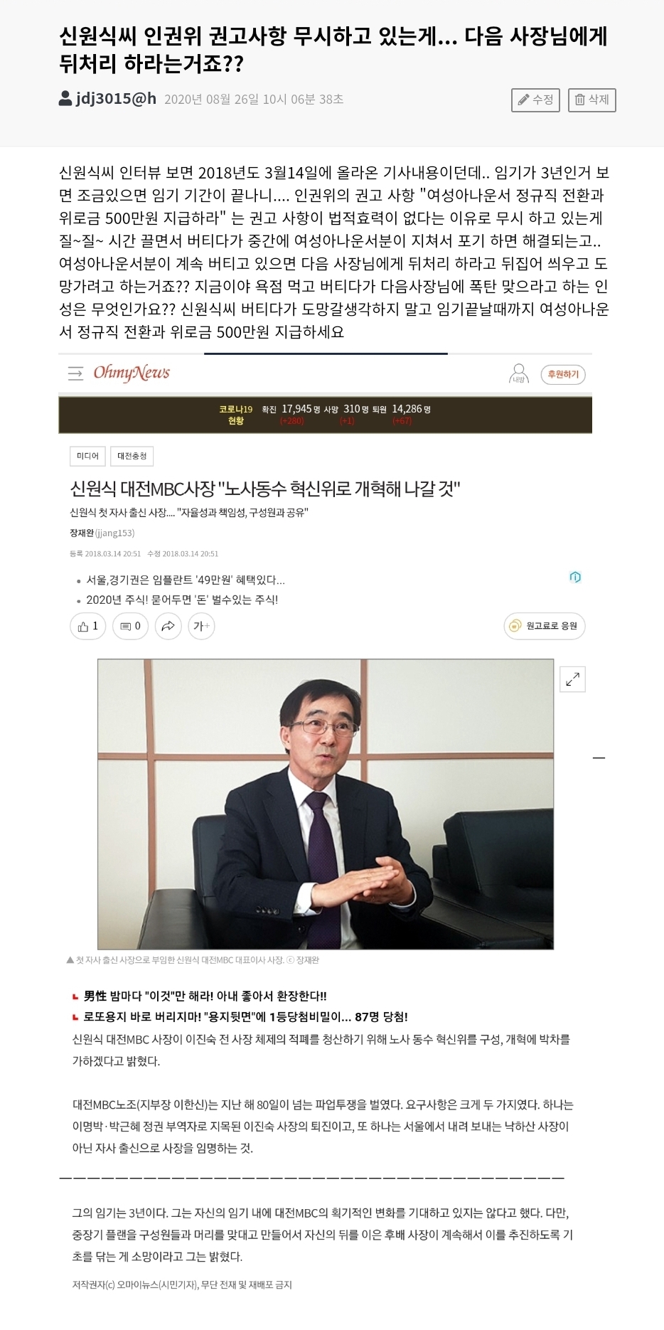 시청자의견 시청자 의견 신원식씨 인권위 권고사항 무시하고 있는게.. 다음 사장님에게 뒤처리 하라는거죠?? 등록일 : 2020-09-10 10:50 조회수 : 210 여러분의 의견을 남겨주세요 ※ 댓글 작성시 상대방에 대한 배려와 책임을 담아 깨끗한 댓글 환경에 동참해 주세요. 0/2000 등록 수정 삭제 이전글 다음글 목록