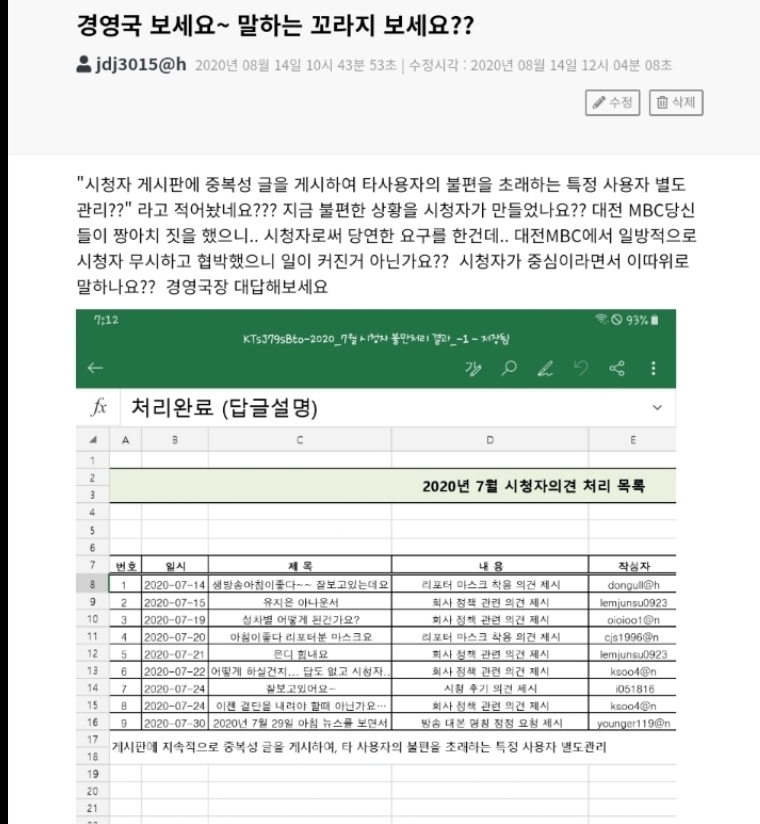 경영국 당신들이 듣기 싫은 소리하는 시청자는 가축처럼 등급을 매겨서 따로 관리한다고 말했는데.. 당신들 가족들도 시청자 이니깐 가족분들도 가축이라고 말하는 거네요??? 지금 방금 가축이랑 같이 밥먹고 출근하신거네요??? 분명히 말합니다 경영국 당신들이 먼저 시청자를 등급매겨서 관리한다고 말했습니다 경영국 당신들 가족들도 가축으로 만들기 싫으면 사과 하세요 시청자 게시판은 시청자의 당연한 요구를 하는 곳입니다 당신들의 가축농장이 아니에요~