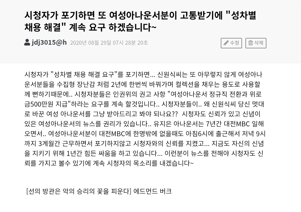 시청자의견 시청자 의견 시청자가 포기하면 또 여성아나운서분이 고통받기에 "성차별 채용 해결" 계속 요구 하겠습니다 등록일 : 2020-09-08 19:05 조회수 : 198 여러분의 의견을 남겨주세요 ※ 댓글 작성시 상대방에 대한 배려와 책임을 담아 깨끗한 댓글 환경에 동참해 주세요. 0/2000 등록 수정 삭제 이전글 다음글 목록