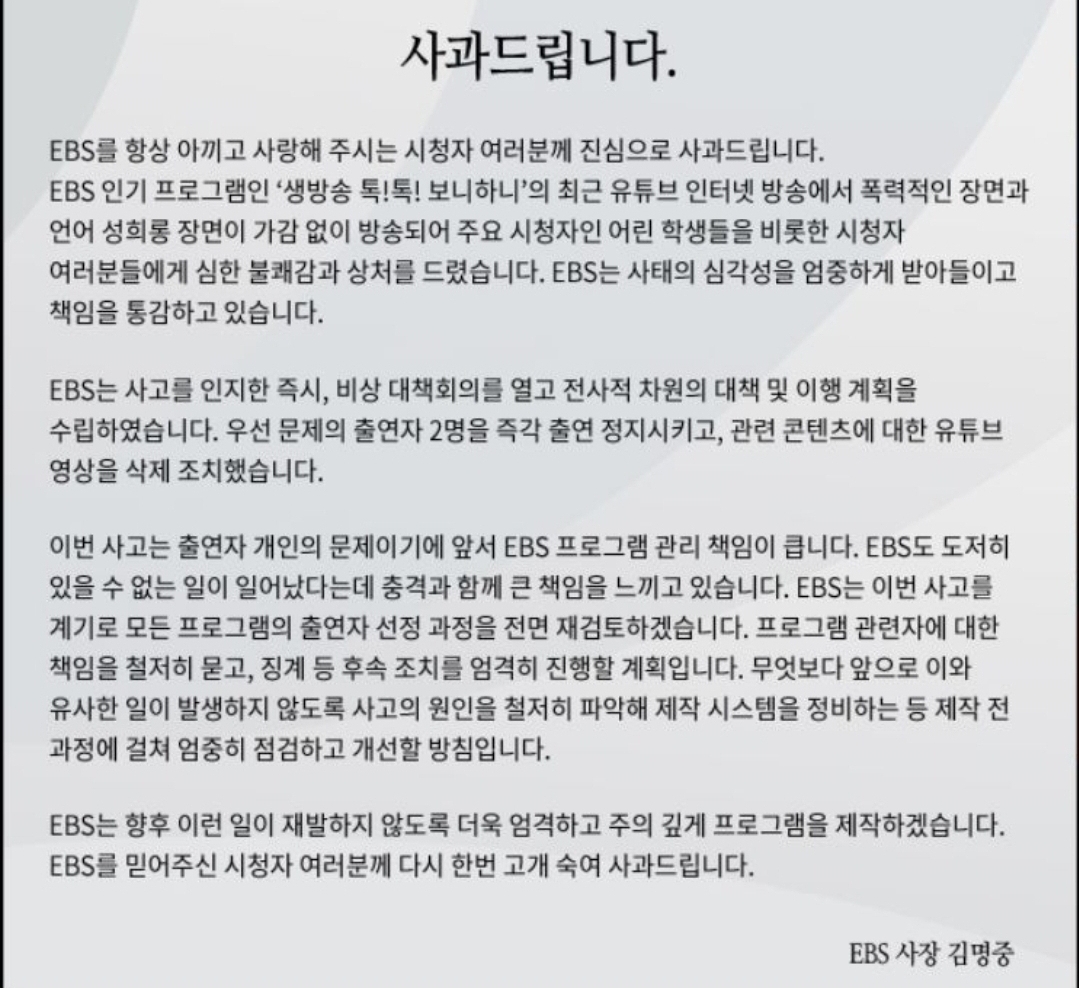 작년 EBS 보니하니 사건이 났을때는 EBS 김명중 사장님께서 잘못을 인정하고 재발방지와 사과문을 올렸는데... 대전MBC 신원식 사장은 정부에서 인정한 인권위의 결정과 시청자의 의견을 무시하고 있는데... 정말 사장님의 인성이 방송국 이미지를 좌우 하는거 같네요... 인성 뭐같은 사장 때문에 대전MBC 돌아가는게 참~~ 예쁘네요 예뻐~~