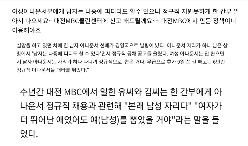 시청자의견 시청자 의견 남자는 나중에 피디라도 할수있다고 여성아나운서분들 정규직 지원못하게 한 간부 누구세요?? 클린센터에 신고하게요 등록일 : 2020-06-01 14:58 조회수 : 240 여러분의 의견을 남겨주세요 ※ 댓글 작성시 상대방에 대한 배려와 책임을 담아 깨끗한 댓글 환경에 동참해 주세요. 0/2000 등록 수정 삭제 이전글 다음글 목록