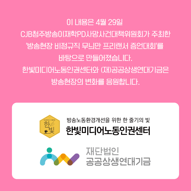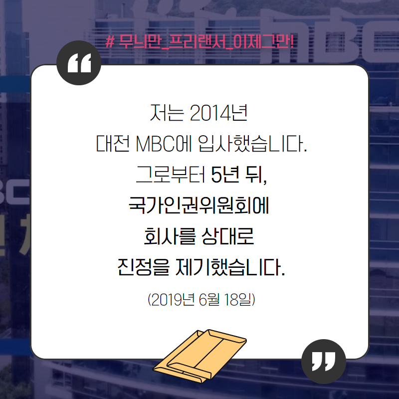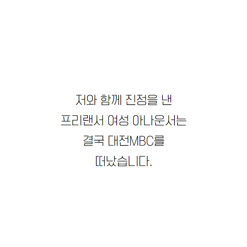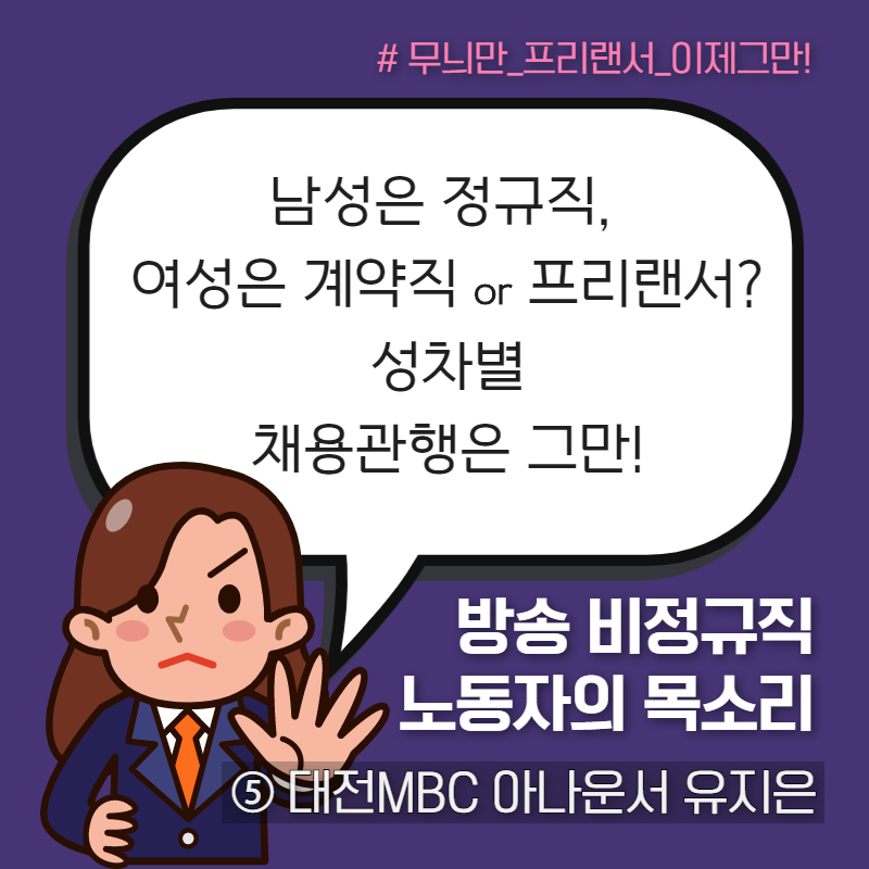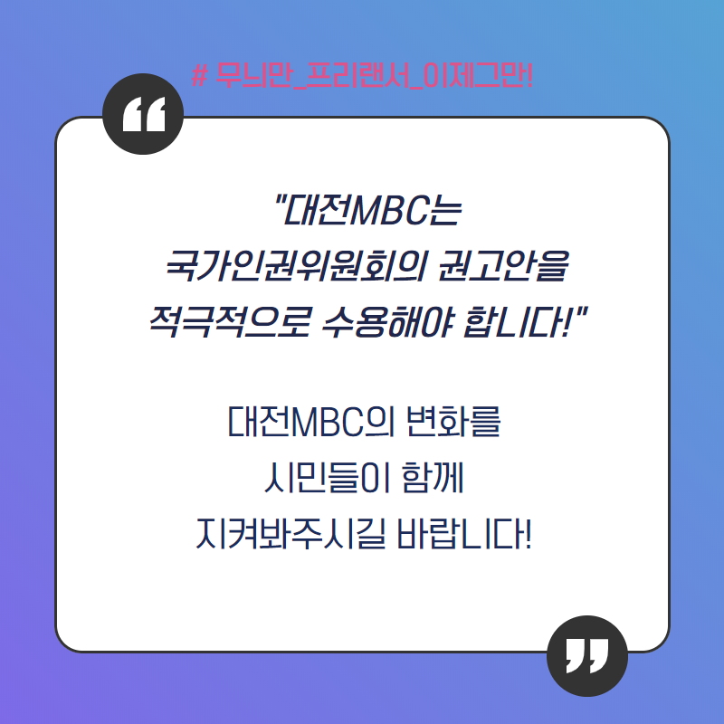 시청자의견 시청자 의견 [카드뉴스] 무늬만 프리랜서 유지은 아나운서 : 대전MBC는 국가인권위원회 시정 권고를 수용하세요! 등록일 : 2020-05-29 17:03 조회수 : 162 첨부파일 f02PTjX3bdi-1.png (118.94 KB) 다운로드 여러분의 의견을 남겨주세요 ※ 댓글 작성시 상대방에 대한 배려와 책임을 담아 깨끗한 댓글 환경에 동참해 주세요. 0/2000 등록 수정 삭제 이전글 다음글 목록
