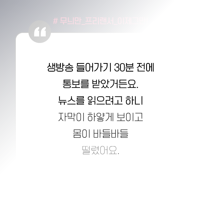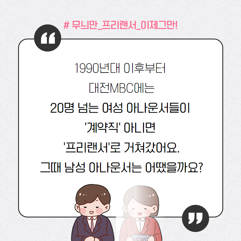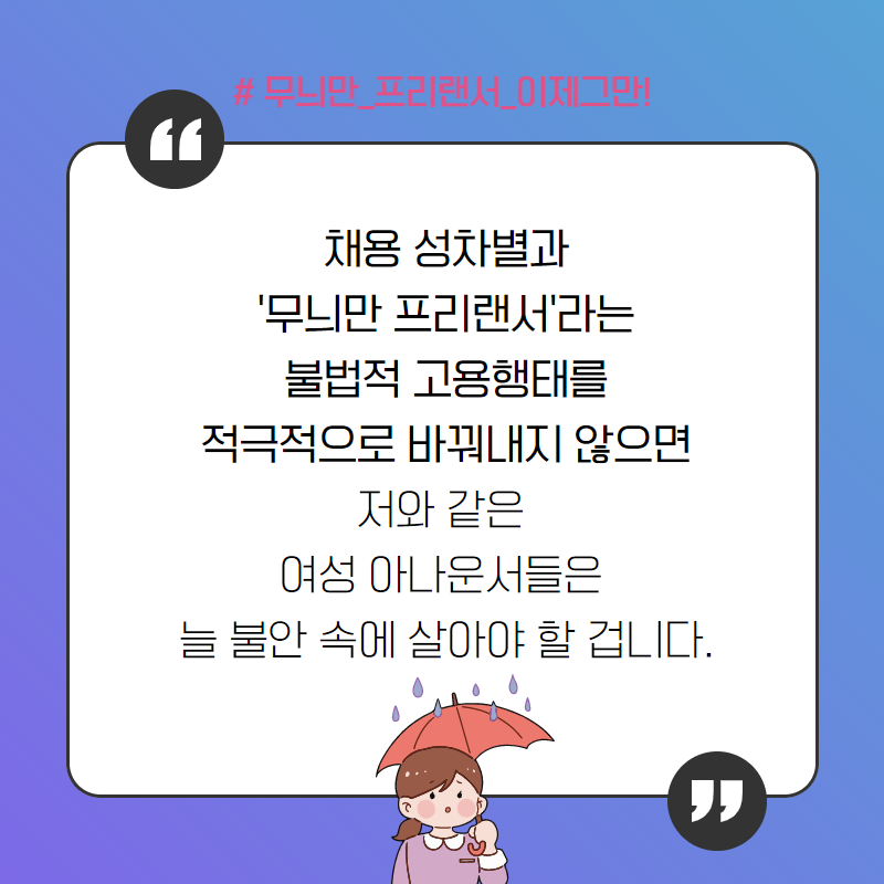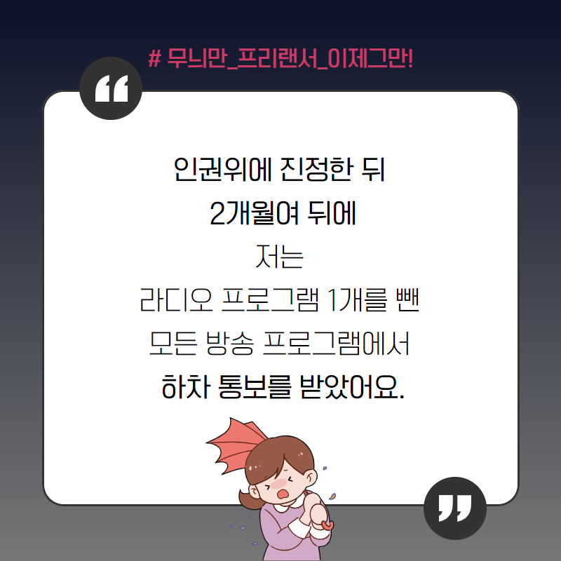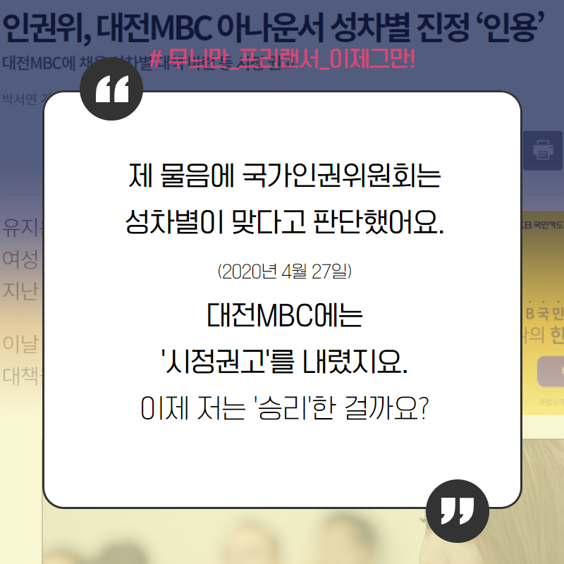 시청자의견 시청자 의견 [카드뉴스] 무늬만 프리랜서 유지은 아나운서 : 대전MBC는 국가인권위원회 시정 권고를 수용하세요! 등록일 : 2020-05-29 17:03 조회수 : 162 첨부파일 f02PTjX3bdi-1.png (118.94 KB) 다운로드 여러분의 의견을 남겨주세요 ※ 댓글 작성시 상대방에 대한 배려와 책임을 담아 깨끗한 댓글 환경에 동참해 주세요. 0/2000 등록 수정 삭제 이전글 다음글 목록