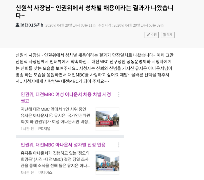 시청자의견 시청자 의견 신원식 사장님~ 인권위에서 성차별 채용이라는 결과가 나왔습니다~ 등록일 : 2020-05-29 17:06 조회수 : 135 여러분의 의견을 남겨주세요 ※ 댓글 작성시 상대방에 대한 배려와 책임을 담아 깨끗한 댓글 환경에 동참해 주세요. 0/2000 등록 수정 삭제 이전글 다음글 목록