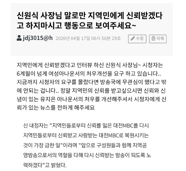 시청자의견 시청자 의견 신원식 사장님 말로만 지역민에게 신뢰받겠다고 하지마시고 행동으로 보여주세요~ 등록일 : 2020-05-30 15:05 조회수 : 148 여러분의 의견을 남겨주세요 ※ 댓글 작성시 상대방에 대한 배려와 책임을 담아 깨끗한 댓글 환경에 동참해 주세요. 0/2000 등록 수정 삭제 이전글 다음글 목록