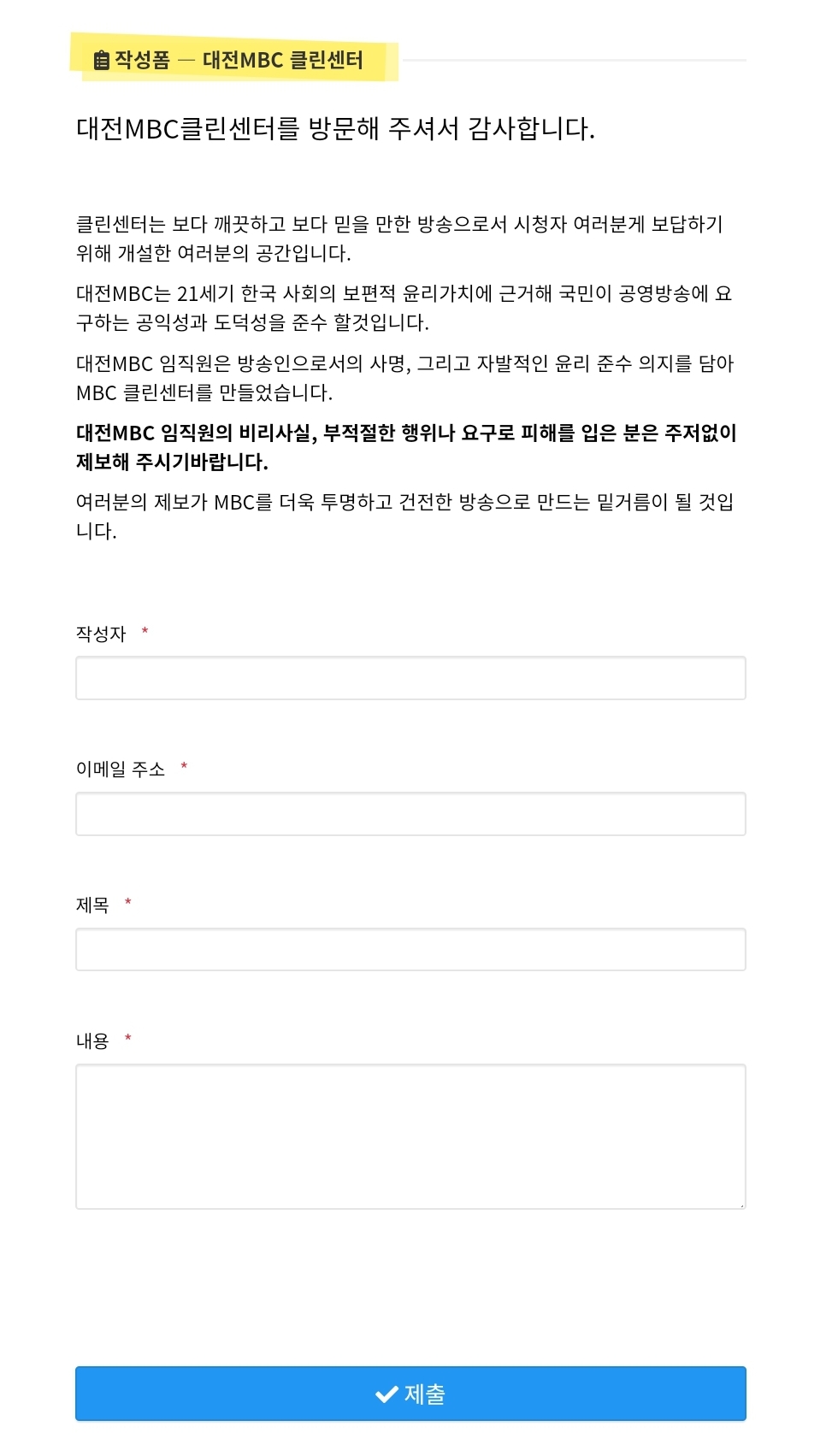 시청자의견 시청자 의견 아니 시청자의 의견은 들을 생각도 안하면서 대전MBC 클린센터는 왜있는 건가요?? 등록일 : 2020-05-30 16:45 조회수 : 169 여러분의 의견을 남겨주세요 ※ 댓글 작성시 상대방에 대한 배려와 책임을 담아 깨끗한 댓글 환경에 동참해 주세요. 0/2000 등록 수정 삭제 이전글 다음글 목록
