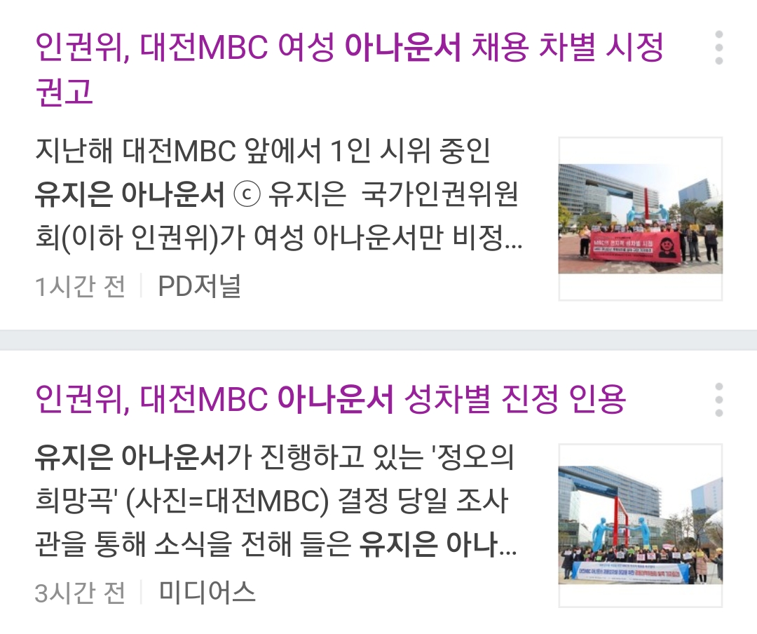 신원식 사장님~ 인권위에서 성차별 채용이라는 결과가 만장일치로 나왔습니다~ 이제 그만 신원식 사장님께서 인터뷰에서 약속하신... 대전MBC 전구성원 공동운명체와 시청자에게는 신뢰를 찾는 모습을 보여주세요.. 시청자는 신뢰와 신념을 가지신 유지은 아나운서님이 방송 하는 모습을 응원하면서 대전MBC를 사랑하고 싶어요 제발~ 올바른 선택을 해주셔서.. 시청자에게 사랑받는 대전MBC가 되어 주세요~~