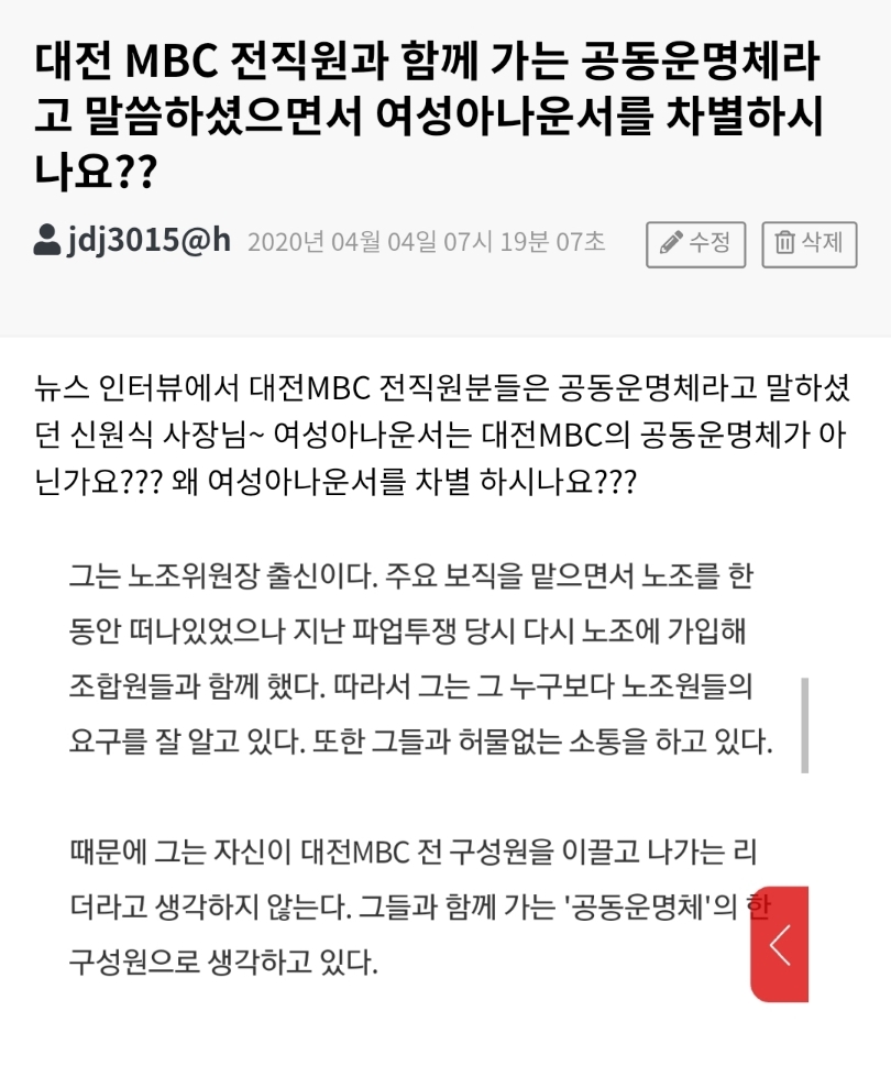 시청자의견 시청자 의견 대전 MBC 전직원과 함께 가는 공동운명체라고 말씀하셨으면서 여성아나운서를 차별하시나요?? 등록일 : 2020-04-20 16:10 조회수 : 180 여러분의 의견을 남겨주세요 ※ 댓글 작성시 상대방에 대한 배려와 책임을 담아 깨끗한 댓글 환경에 동참해 주세요. 0/2000 등록 수정 삭제 이전글 다음글 목록
