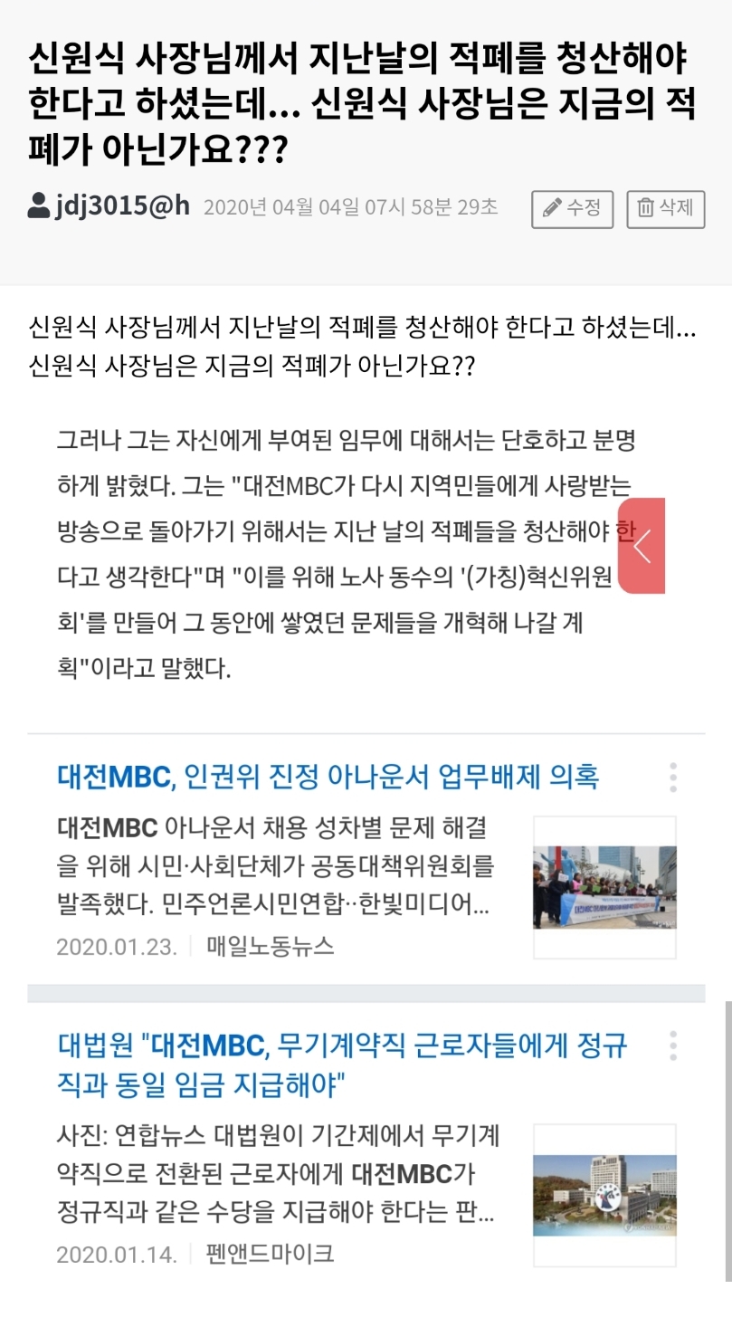 시청자의견 시청자 의견 신원식 사장님께서 지난날의 적폐를 청산해야 한다고 하셨는데... 신원식 사장님은 지금의 적폐가 아닌가요?? 등록일 : 2020-04-20 16:11 조회수 : 156 여러분의 의견을 남겨주세요 ※ 댓글 작성시 상대방에 대한 배려와 책임을 담아 깨끗한 댓글 환경에 동참해 주세요. 0/2000 등록 수정 삭제 이전글 다음글 목록