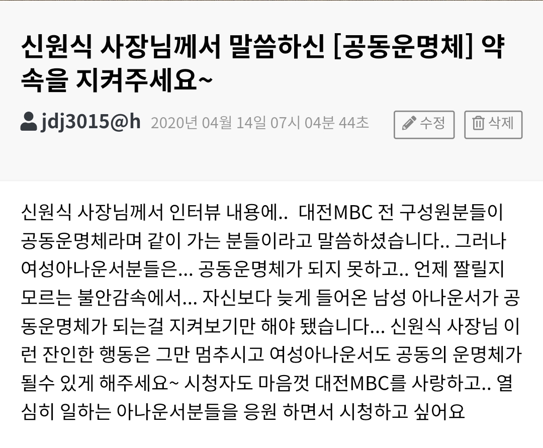 시청자의견 시청자 의견 신원식 사장님께서 말씀하신 [공동운명체] 약속을 지켜주세요~ 등록일 : 2020-04-20 15:58 조회수 : 124 여러분의 의견을 남겨주세요 ※ 댓글 작성시 상대방에 대한 배려와 책임을 담아 깨끗한 댓글 환경에 동참해 주세요. 0/2000 등록 수정 삭제 이전글 다음글 목록