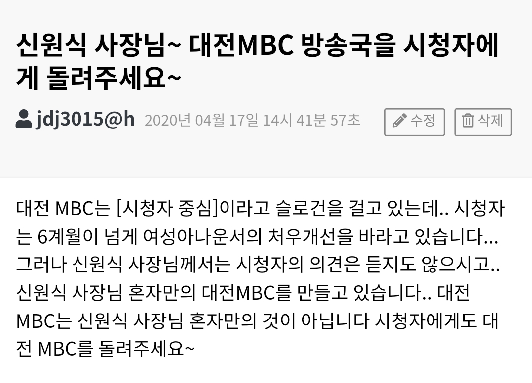 시청자의견 시청자 의견 신원식 사장님~ 대전MBC 방송국을 시청자에게 돌려주세요~ 등록일 : 2020-04-20 16:01 조회수 : 120 여러분의 의견을 남겨주세요 ※ 댓글 작성시 상대방에 대한 배려와 책임을 담아 깨끗한 댓글 환경에 동참해 주세요. 0/2000 등록 수정 삭제 이전글 다음글 목록